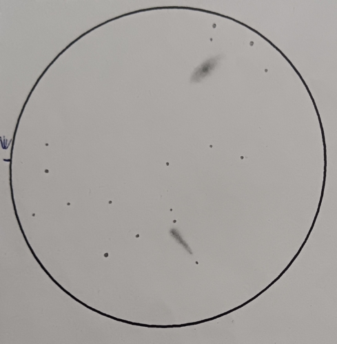 B-al is azonosítható halvány, majdnem csillagszerű foltocska, kissé halványabb, mint az egy LM-ben lévő M 81. 5L-8T-vel már határozott ködfolt, hosszúkás 1:3 arányban, K-NY fekvéssel, 8L-10T-vel szivar vagy orsó alakú; érdekes hogy kisebb /20x/ nagyítással hajtott formája van, ami arra utal, hogy a legfényesebb része nem a közepén van. 40-60x-al látható egy fényesebb mag, s úgy tűnik, hogy az É-i része kipúposodik és nem olyan éles, kontrasztos mint a D-i. 15-20T kis nagyításokkal nem hoz elő újabb dolgokat, de 60-80x már nagyon halvány, sötét sávszerű bevágásokat mutat, amelyeket azonban a legkisebb légköri rendellenesség is eltüntet. Ennél az objektumnál jól használhatók a nagyobb nagyítások, A GX ÉK-i szélének közvetlen közelében látható egy kb. 9 mg-s csillagocska.